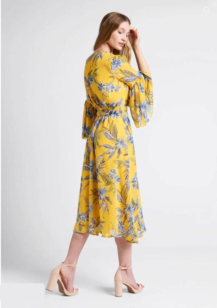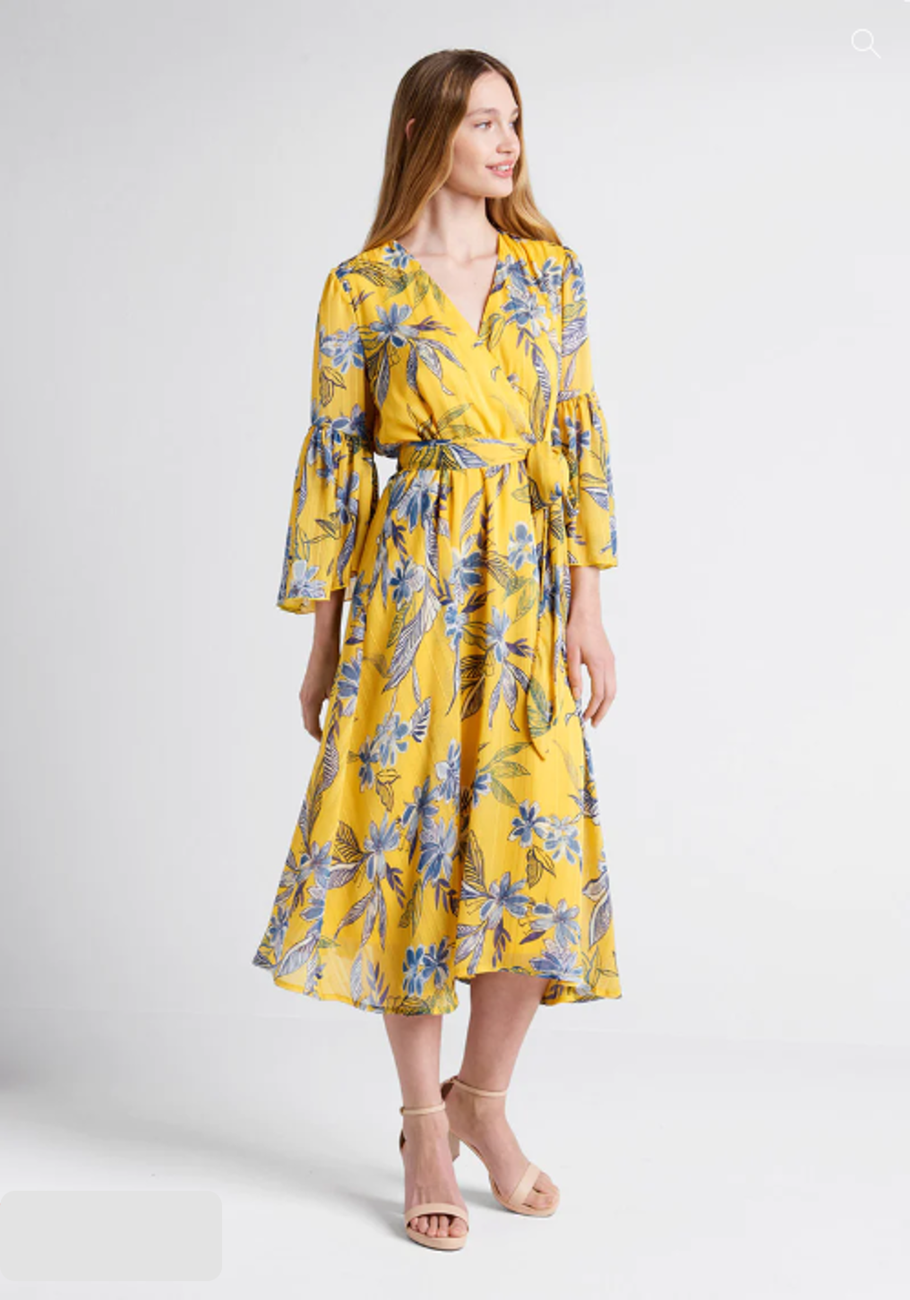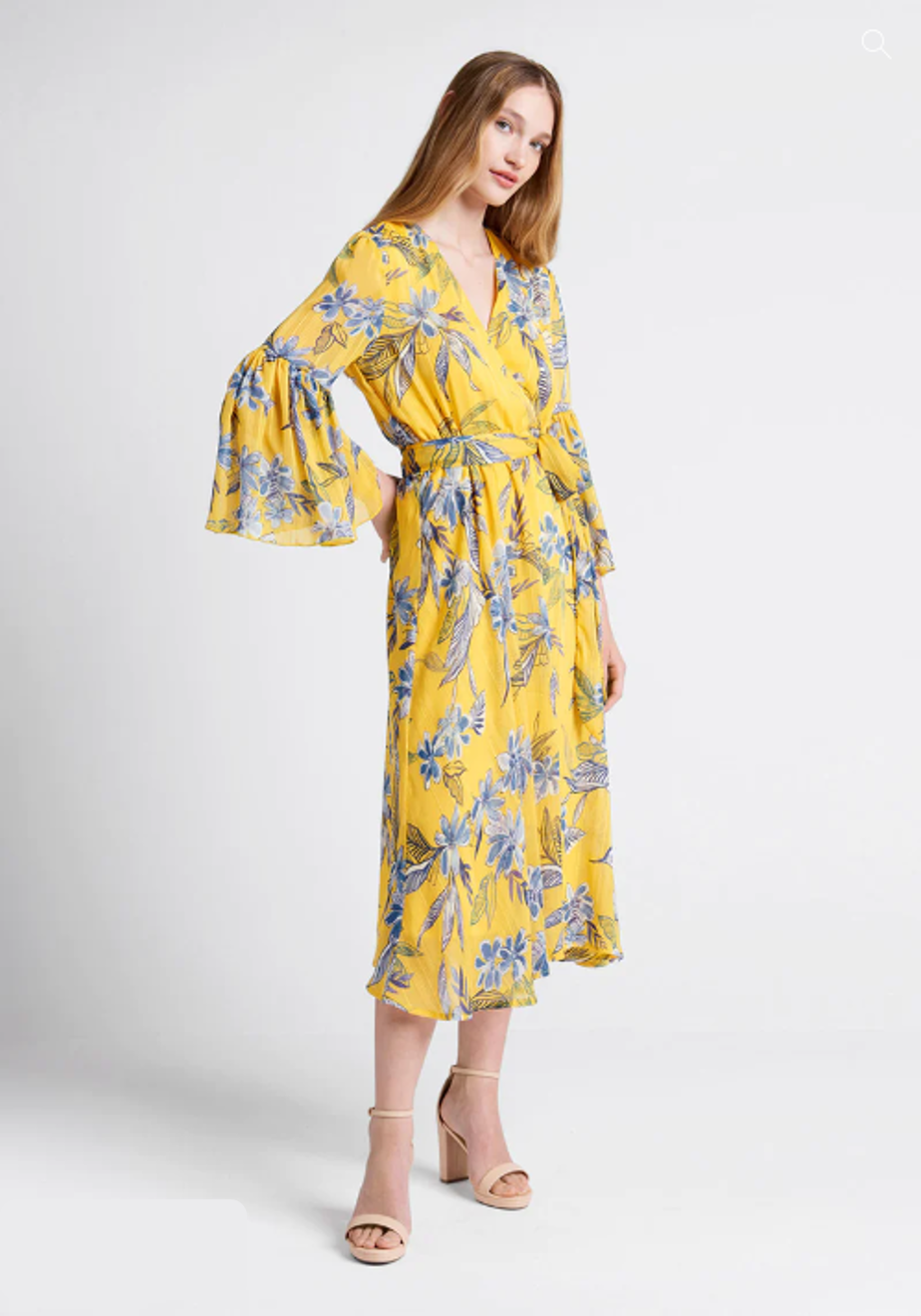 Effortlessly elevated, this beautiful floral dress from Parker and Rowe is like stepping into a tropical garden with its all-over print of exotic blue and white blooms scattered amidst arching fronds. Made from a crepey sunshine yellow fabric interwoven with metallic gold specks, this summery midi dress boasts longline flutter sleeves, a stylish surplice neckline, and an elasticized high-rise waist that gives way to a flowy midi skirt. The matching tie-bow belt gives the option of creating a wrap dress look that is oh-so-retro!