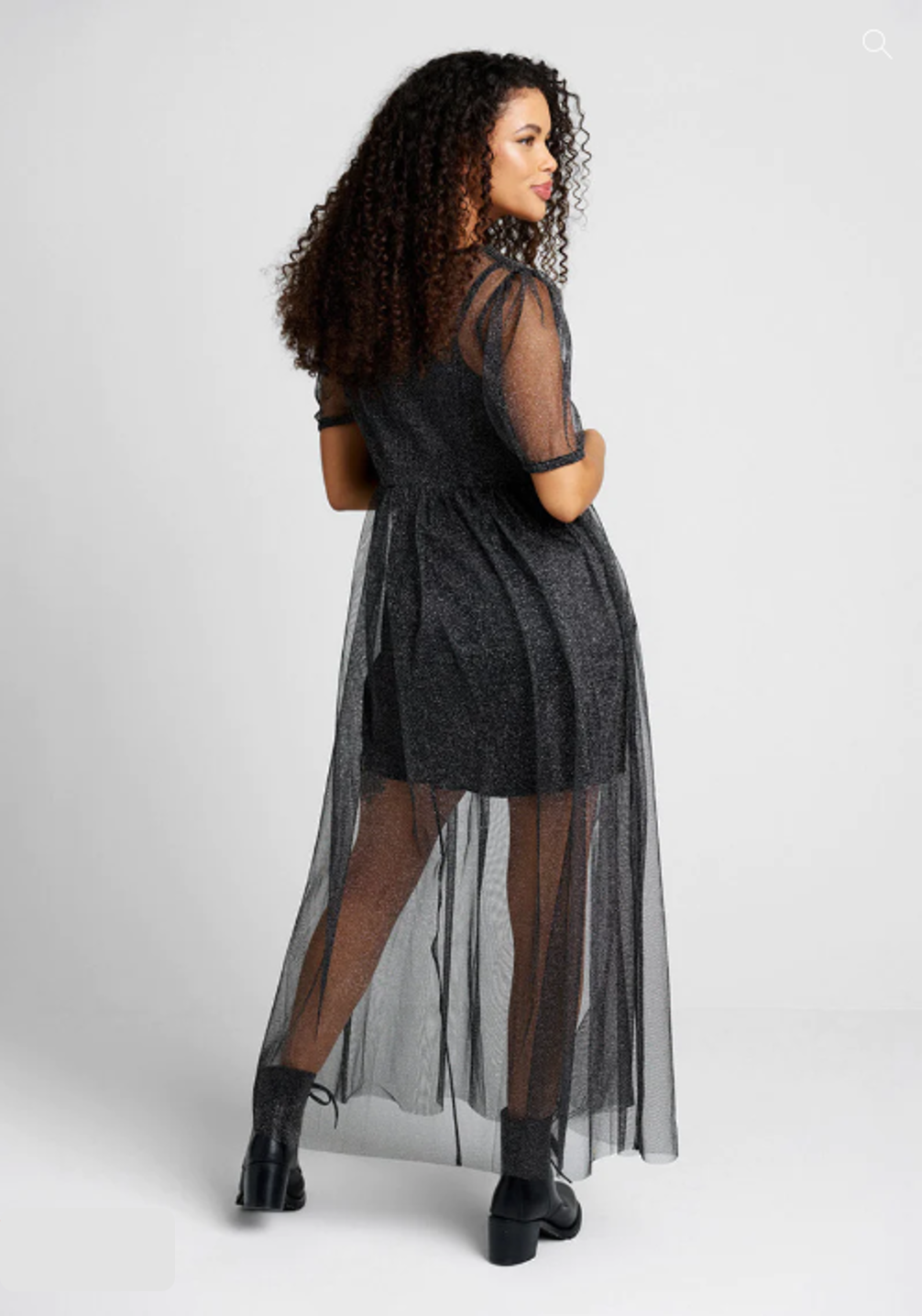 Shimmering like a starry night, this black mesh midi dress from Aussie Brand Dangerfield is such a fun and flirty layering piece to mix and match! Made from a sheer and sparkling mesh, this black party dress boasts semi-fitted bodice with a round neckline and short puff sleeves, and a gathered high-rise waistline that gives way to a floaty mid-length skirt that dazzles. Wear atop a slip dress (not included), shorts and a bralette, or any which way your imagination takes you.